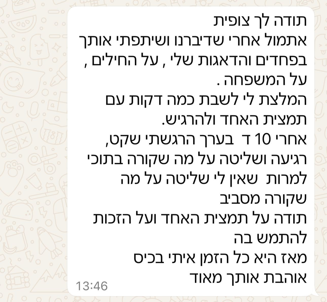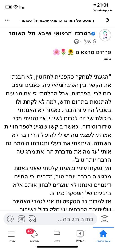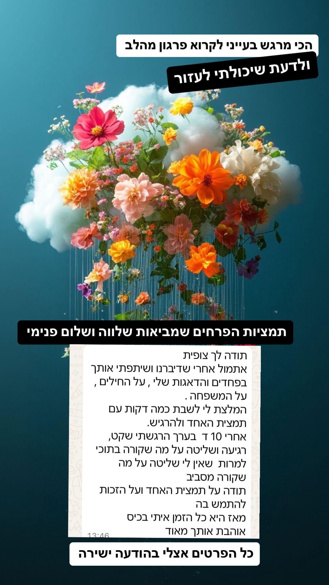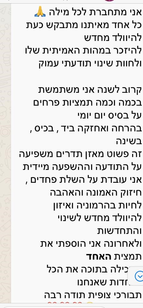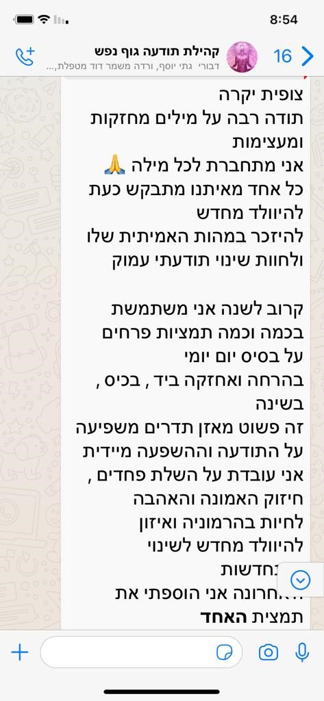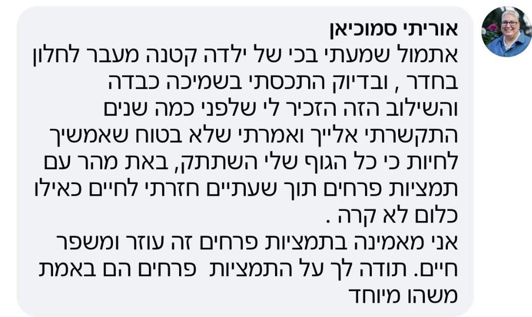 היום הסתיימה לה סדנת פרחים טיפולית בשיבא, ואני מאוד אמוציונלית.... עבורי - הסדנא הזו היא פשוט מצילת חיים!!!!!!!!!!!! אני בת 48 וסובלת ממחלות כרוניות נדירות קשות. היומן שלי מלא בימי אישפוז, עירויים קשים, טיפולים לא פשוטים ובדרך המון כאבים, קושי נפשי ופיזי. האנשים שאני פוגשת הכי הרבה הם צוותים רפואיים - רופאים, אחיות, במרפאות, מוקדים, בעקבות הרזומה הרפואי המכובד שלי (...) אני לא עובדת כבר מספר שנים, ואני באופן יומיומי נמצאת בטיפולים, כל יום יש איזו משימה רפואית, לפעמים גם
