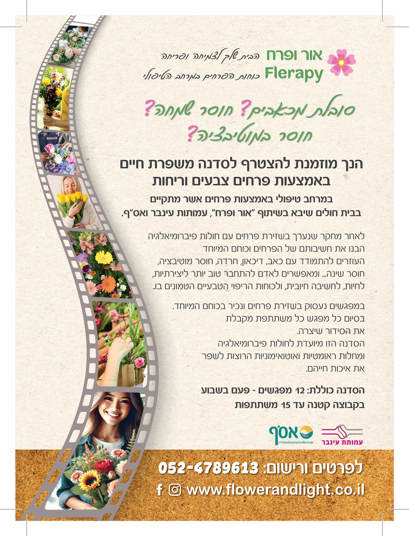 לאחר מחקר רפואי שנערך בשזירת פרחים עם חולות פיברומיאלגיה – הבנו את חשיבותם של הפרחים וכוחם המיוחד העוזרים להתמודד עם כאב, דיכאון, חרדה, חוסר מוטיבציה, חוסר שינה ....