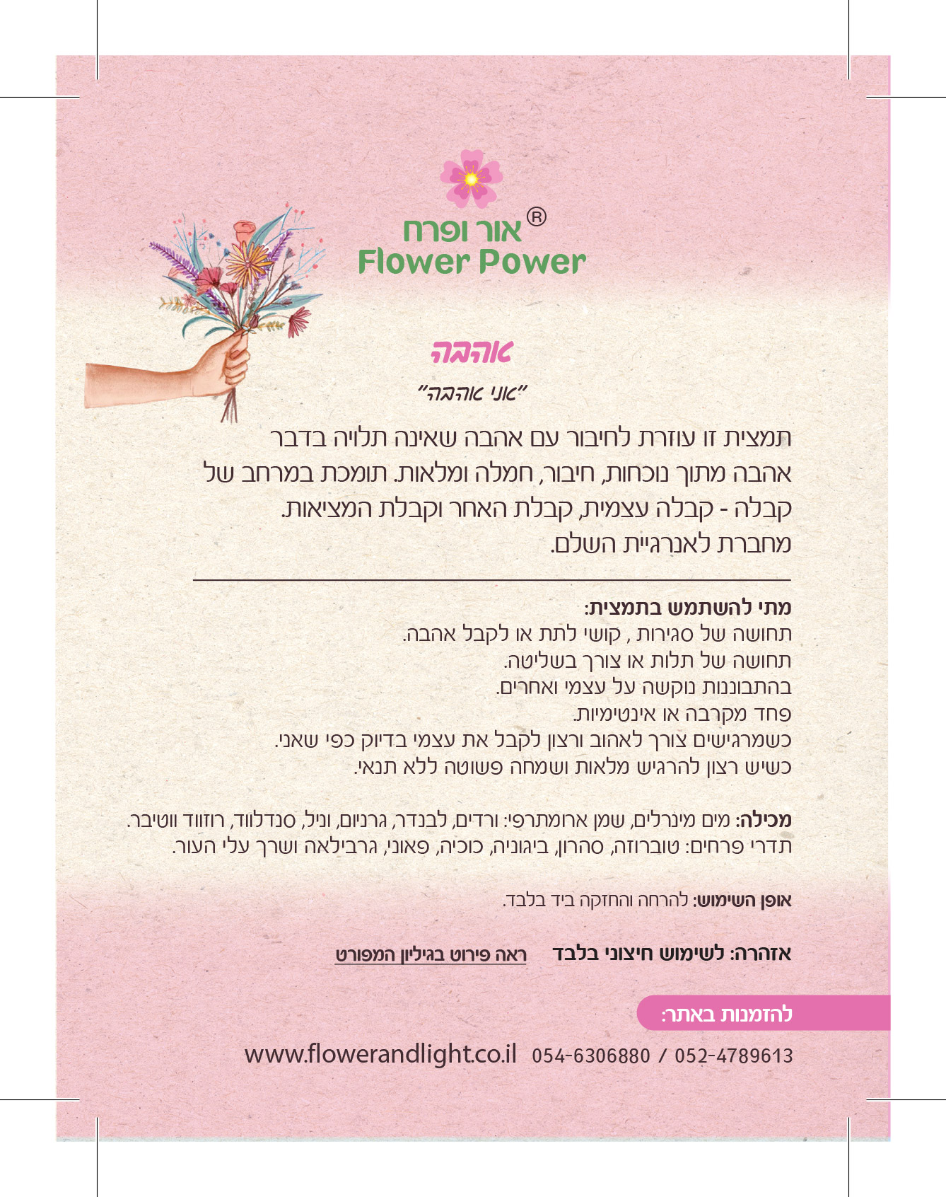 תמצית זו עוזרת לחיבור עם אהבה שאינה תלויה בדבר אהבה מתוך נוכחות, חיבור, חמלה ומלאות. תומכת במרחב של קבלה – קבלה עצמית, קבלת האחר וקבלת המציאות.