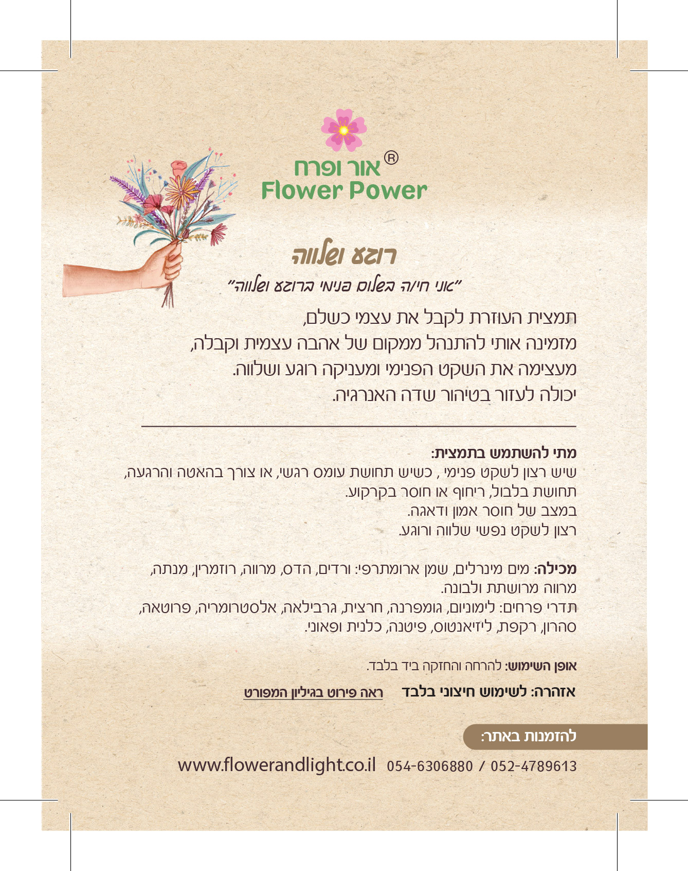 תמצית העוזרת לקבל את עצמי כשלם, מזמינה אותי להתנהל ממקום של אהבה עצמית וקבלה, מעצימה את השקט הפנימי ומעניקה רוגע ושלווה.